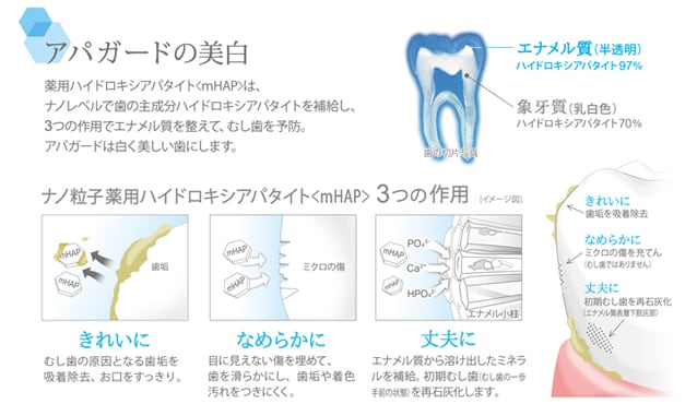アパガードはエナメル質を健康な状態に保つことで、ツヤ・輝きのある歯本来の白さを引き出します。「医薬部外品/薬用歯みがき」