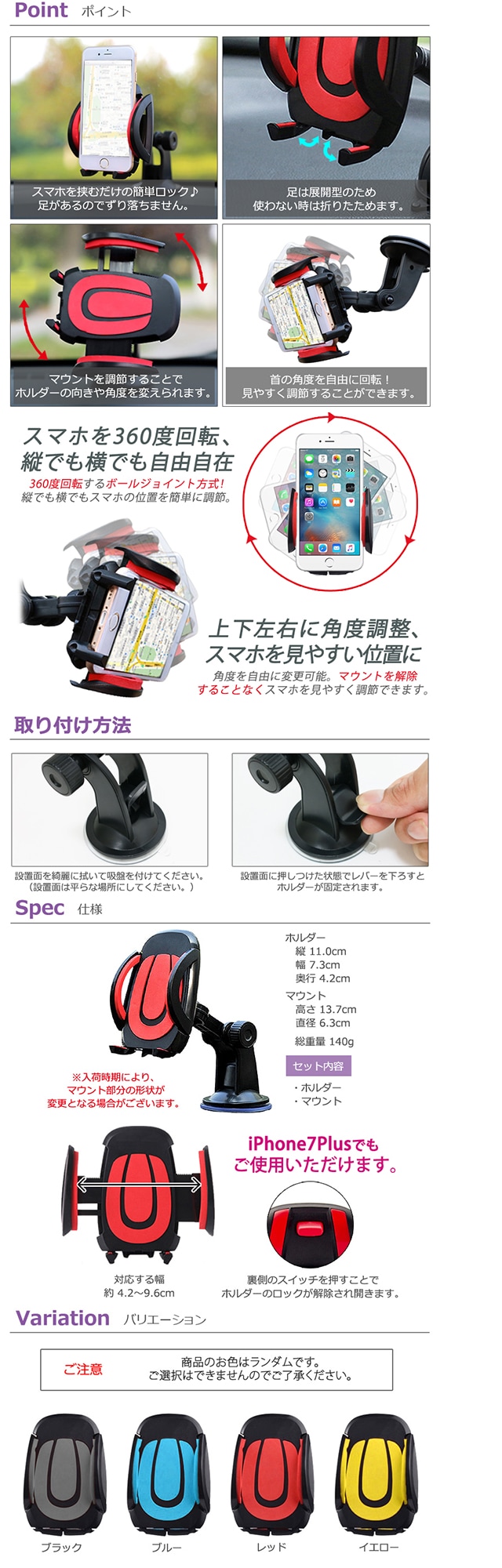 スマホ車載ホルダー | iPhone全機種&大き目スマホにも対応!360度首ふりヘッド採用 ※カラーランダム