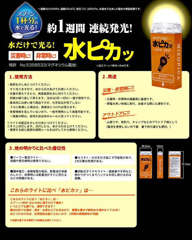 水につけるだけで1週間ライト点灯「水ピカ!」 2個 | いざという時の備えに!