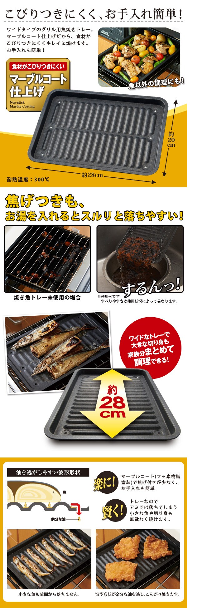 ワイドなトレーで大きな魚も切らずに調理!ししゃものような小さな魚も隙間から落ちません。マーブルコート(フッ素樹脂塗装)で焦げ付きが少なく、お手入れ簡単。トレーなので網では落ちてしまう小さな魚や切り身も無駄なく焼けます。