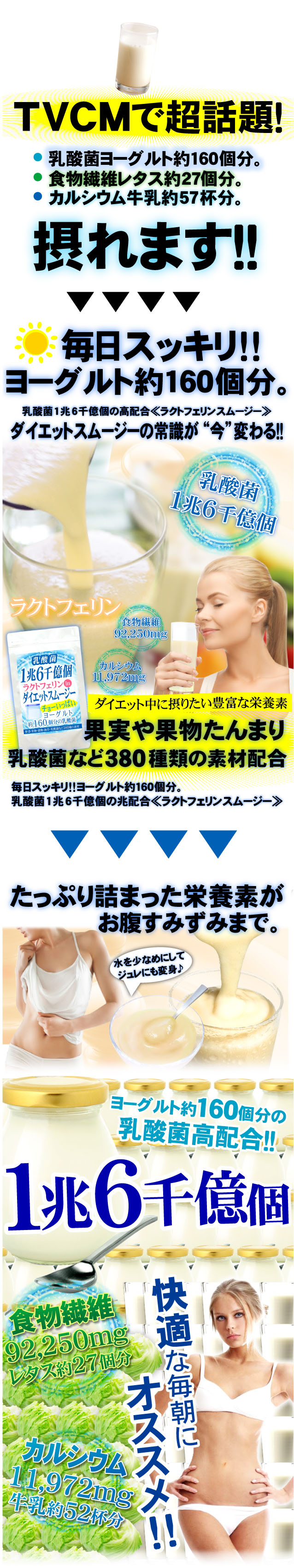 ラクトフェリンスムージー 160g(約32杯分) | 毎朝爽快に一杯♪ヨーグルト約160個分。乳酸菌1兆6千億個配合&レタス約27個分の水溶性食物繊維92,250mgでスッキリ