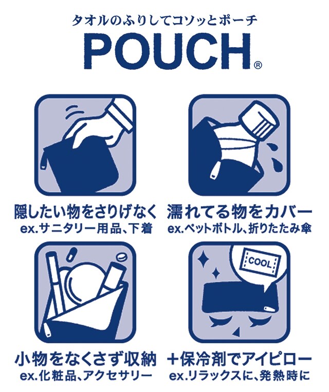 サニタリー用品などをさり気なく持ち歩けるポーチがあったらいいのに…。そんな思いつきから始まった、どっとポーチ「ミニタオルを2つ折りしてファスナーをつける」たったそれだけのアイデアですが、ありそうでなかった商品が生まれました☆