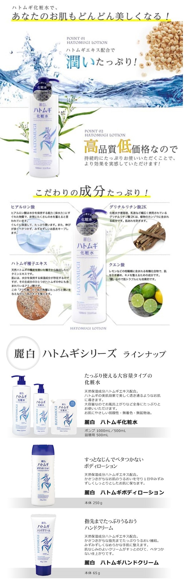 [本体 大容量サイズ]麗白 ハトムギ化粧水 1,000ml×2個 | かさつきがちなお肌にもたっぷりうるおいを補給。みずみずしくキメ細かいお肌に整えます。