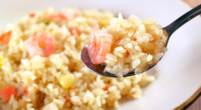 原材料:精白米(国産)、野菜[たまねぎ(国産)、にんじん、とうもろこし、ピーマン]、えび、なたね油、液卵、チキンブイヨン(乳成分・小麦・豚肉・大豆・ごまを含む)、マーガリン、食塩、バターフレーバーオイル、しょうゆ、ワイン、砂糖、ホワイトペッパー/調味料(アミノ酸等)、pH調整剤、香料、着色料(カロチノイド、カラメル)、酸味料