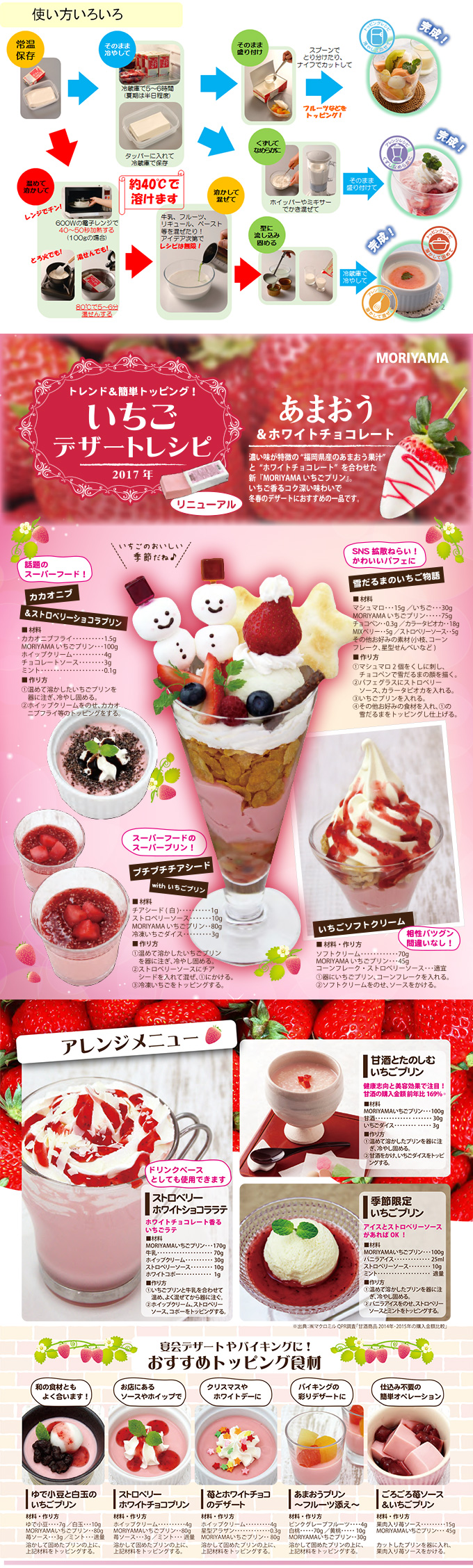 福岡県産「あまおう」果汁とホワイトチョコでコクのある味わいに仕上げました。ミルク分をプレミックスしてありますので、お店のオペレーションを軽減できます。