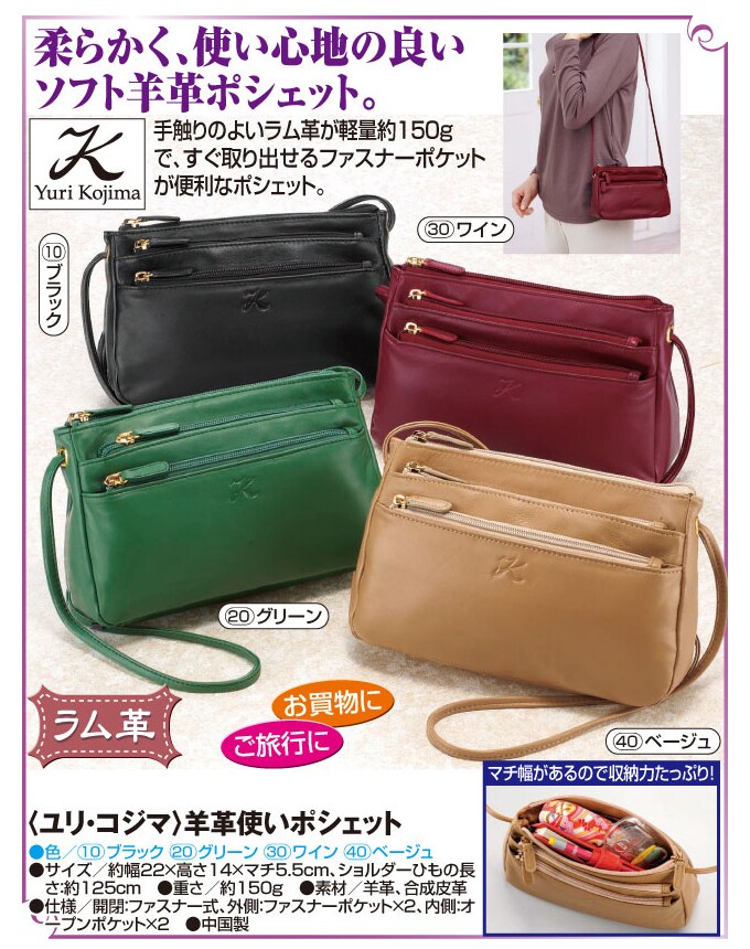 [ベージュ]<ユリ・コジマ>羊革使いポシェット | 柔らかく、使い心地の良いソフト羊革ポシェット。手触りのよいラム革を使用し、すぐ取り出せるファスナーポケットが便利なポシェット。