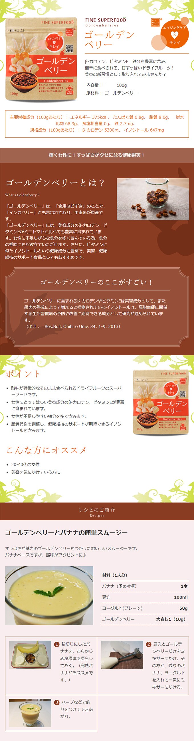 ゴールデンベリーはβ-カロテン、鉄分、イノシトールを豊富に含む、甘酸っぱいスーパーフルーツとして欧米で広く親しまれています。美容成分と不足しやすい鉄分がたくさん摂れる、女性のためのスーパーフードです。