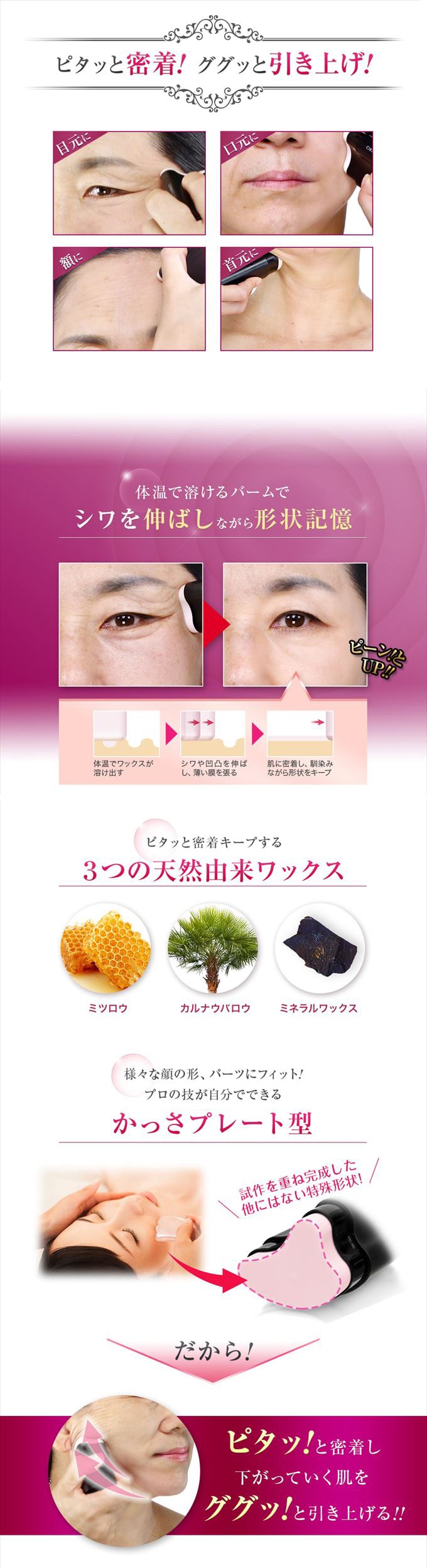 かっさプレート型の美容液バームをお肌に密着させて、引き上げるように2~3回ご使用ください。