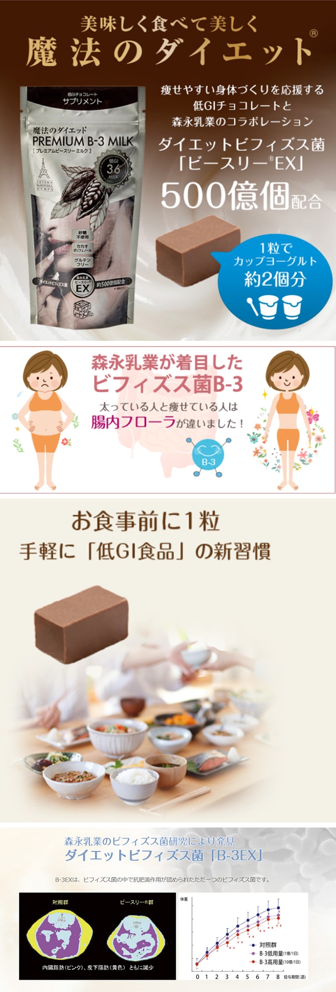 ヨーロッパを代表するショコラティエに愛されるバリーカレボー社のベルギー産プレミアムショコラを贅沢に使用し、抗肥満作用のあるビフィズス菌B-3EXを配合した低GI「高機能チョコレートサプリメント」。
