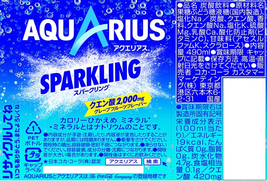 [48本]コカ・コーラボトラーズジャパン アクエリアス スパークリング 490ml PET | 夏場の運動時や、日常の水分補給に炭酸でリフレッシュ!