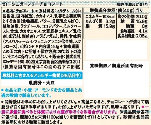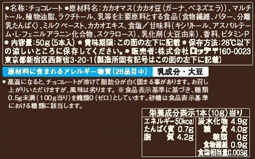砂糖や乳糖等の糖類ゼロにも関わらず、コク深いチョコレートの美味しさを存分に楽しめるロッテの独自技術で作られたチョコレートです。