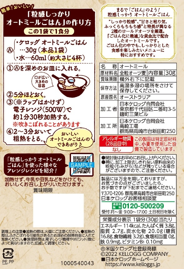 [100個]日本ケロッグ 粒感しっかり オートミールごはん 30g (試供品) | いつものごはんの代わりに!糖質オフ、食物繊維たっぷり!
