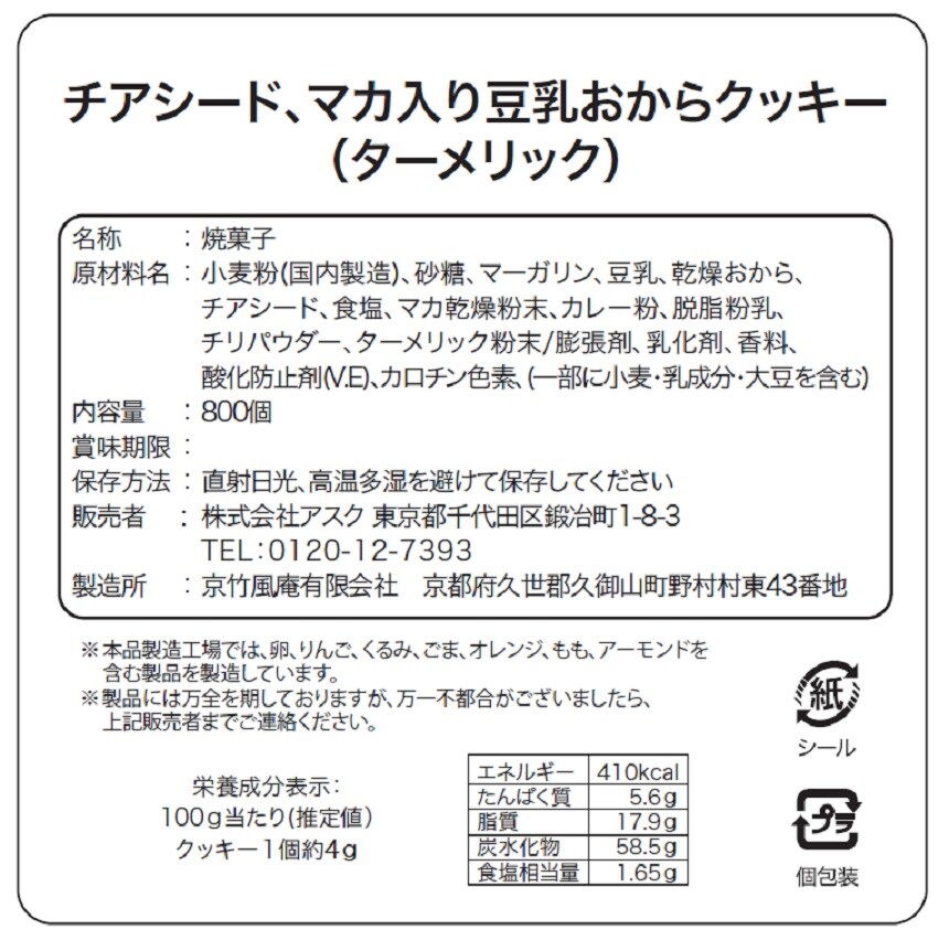 [800枚]アスク チアシード、マカ入り豆乳おからクッキー ターメリック 約4g | 水分で膨らむチアシードとおからでダブルの満腹感!個包装で持ち運びも便利!