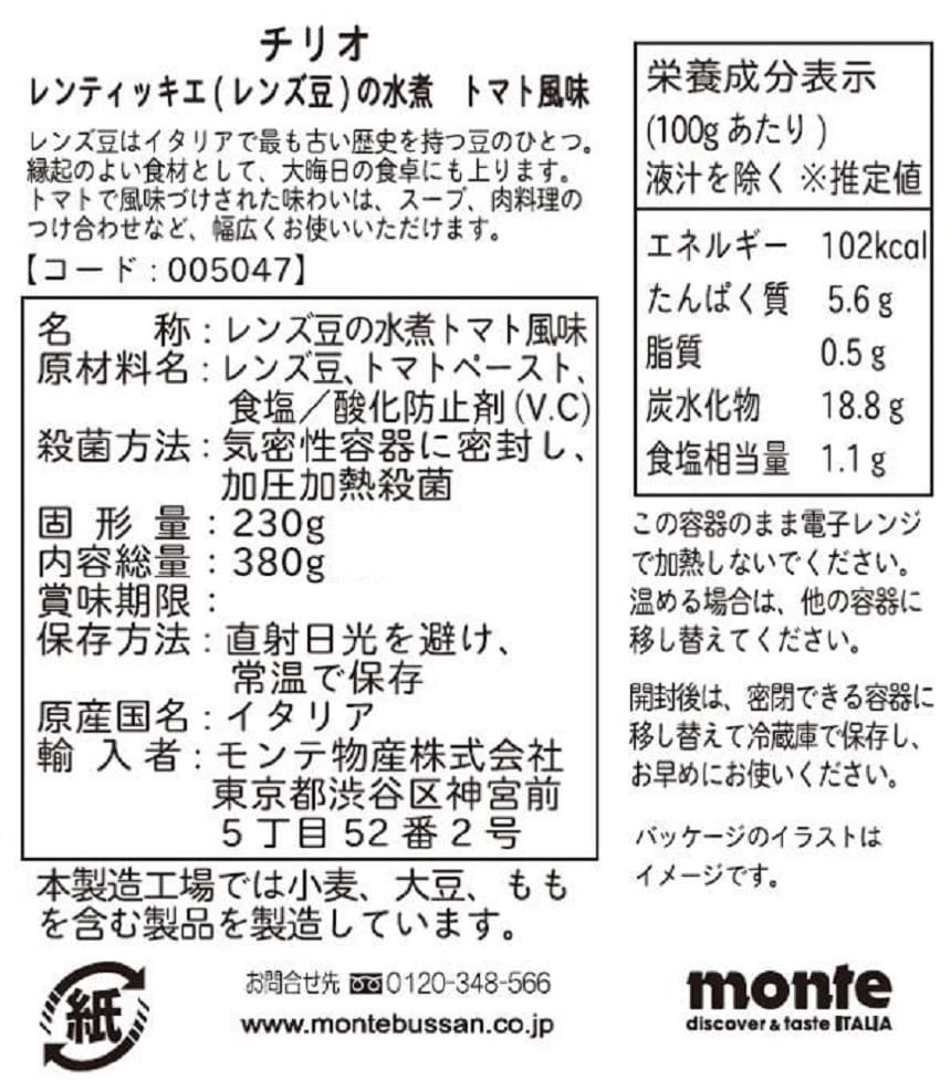 - チリオ レンティッキエ(レンズ豆)の水煮トマト風 380g