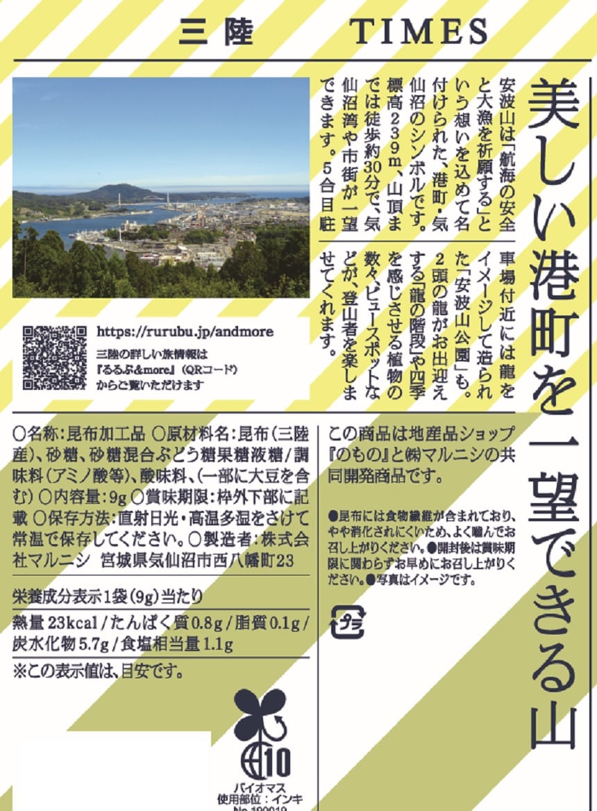 三陸沿岸の豊かな栄養のもとで育った、三陸産こんぶを使用しました。早採れの柔らかい昆布に、味をつけ・乾燥させて食べやすいサイズに仕上げました。噛むほどに口いっぱいに昆布の美味しさを楽しめます。