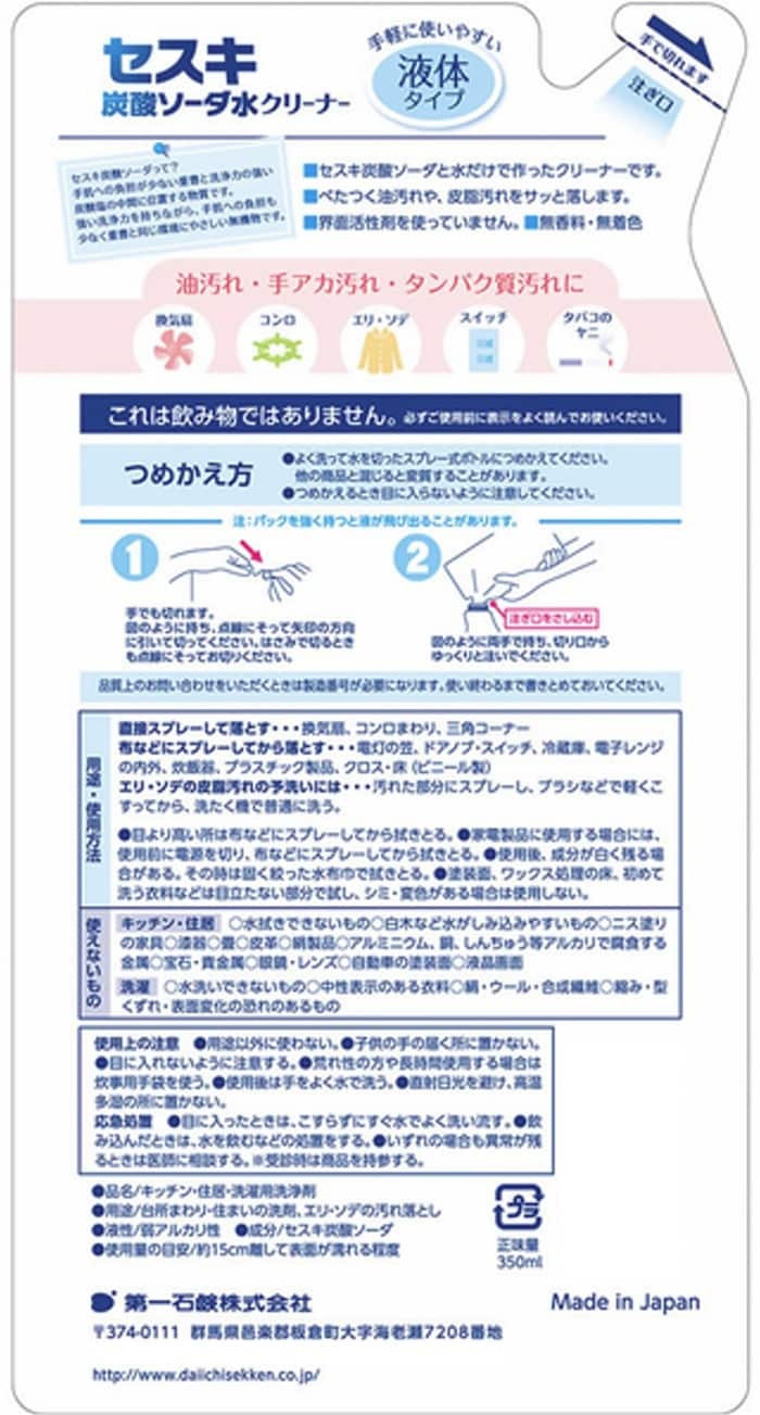 [20個]第一石鹸 キッチンクラブ セスキ炭酸ソーダ水クリーナー 詰替用 350ml | セスキ炭酸ソーダと水だけで作ったクリーナーです