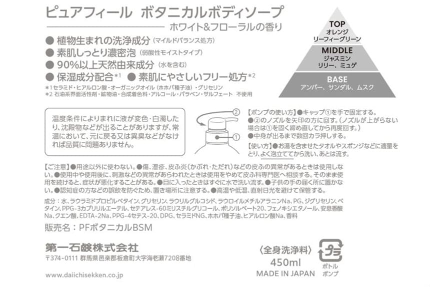[6個]第一石鹸 ピュアフィール ボタニカルボディーソープ ホワイト&フローラル 本体 450ml | 「洗浄力」と素肌への「やさしさ(弱酸性)」を併せ持つマイルドバランス処方