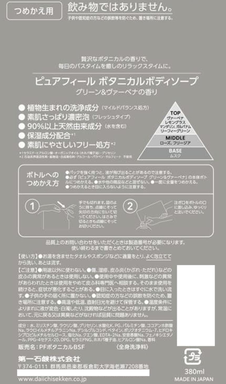 [20個]第一石鹸 ピュアフィール ボタニカルボディーソープ グリーン&ヴァーベナ 詰替 380ml | 「洗浄力」と素肌への「やさしさ(弱酸性)」を併せ持つマイルドバランス処方