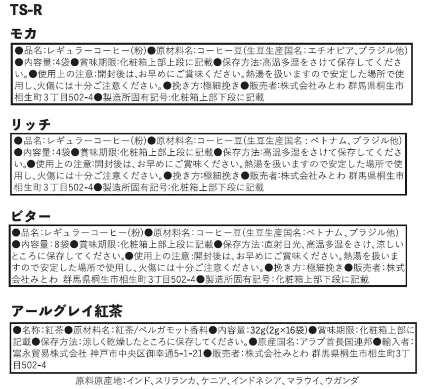 3種(モカ・リッチ・ビター)のドリップコーヒーと、アールグレイ紅茶のセット