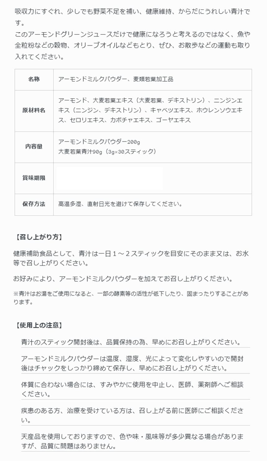 大麦若葉青汁(3gあたり)熱量9~12kcal、タンパク質0.3~0.5g、脂質0~0.1g、炭水化物2.1~2.6g、食塩相当量0.01~0.07g/アーモンドミルクパウダー(100gあたり)熱量649kcal、タンパク質28.4g、脂質56.3g、炭水化物11.1g、食塩相当量0.03g