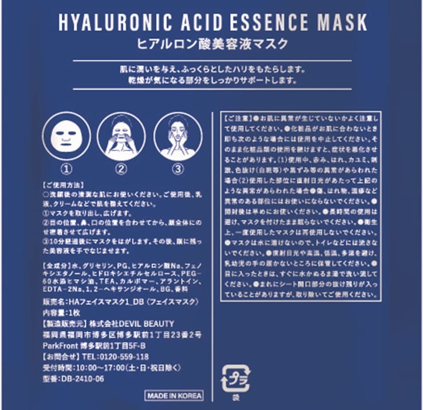 ヒアルロン酸(保湿)配合。マスクの密閉効果で美容液が角質層にしみわたり、 みずみずしくうるおい感あふれる素肌にみちびきます。