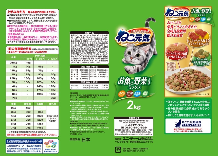 [1個]ユニ・チャーム ねこ元気 お魚と野菜ミックス 2kg