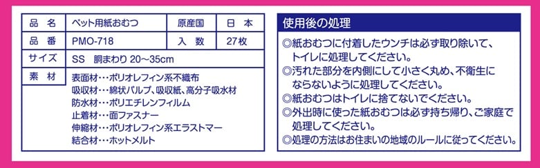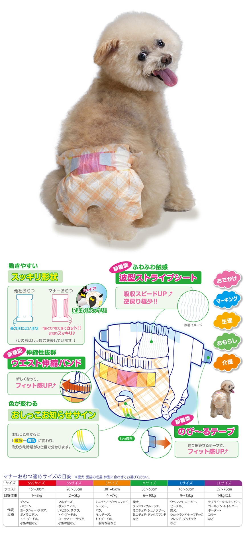 「おでかけ」「マーキング」「生理」「おもらし」「介護」など、パピーからシニアまでずっと安心して使える紙おむつです。