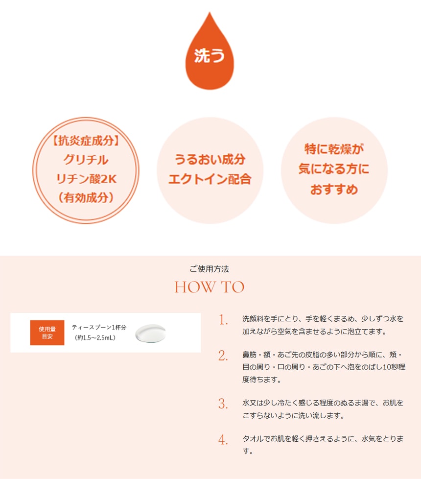 抗炎症成分グリチルリチン酸2K(有効成分)配合。またうるおい成分エクトインを配合し、お肌の炎症をおさえながら、やさしくしっとりと洗い上げます。キメ細かな泡が特徴的な弱酸性の液体洗顔料です。