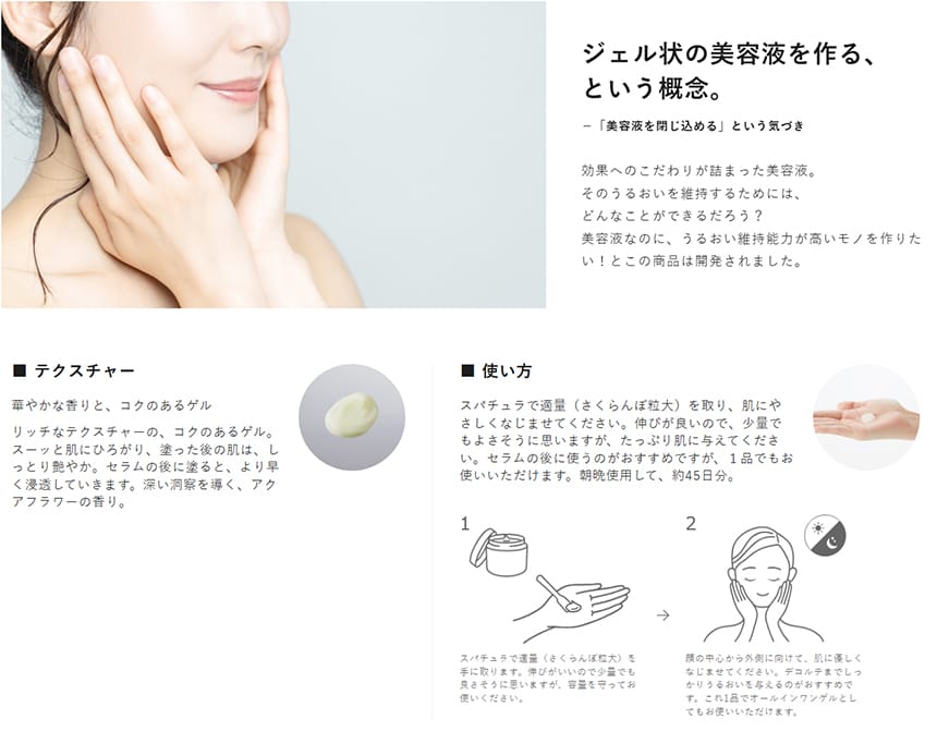 ナイアシンアミド(うるおい成分)配合。うるおいパック処方で必要な成分を肌に閉じ込める、リンクル美容ゲル。うるおい溢れるハリ肌を叶えます。