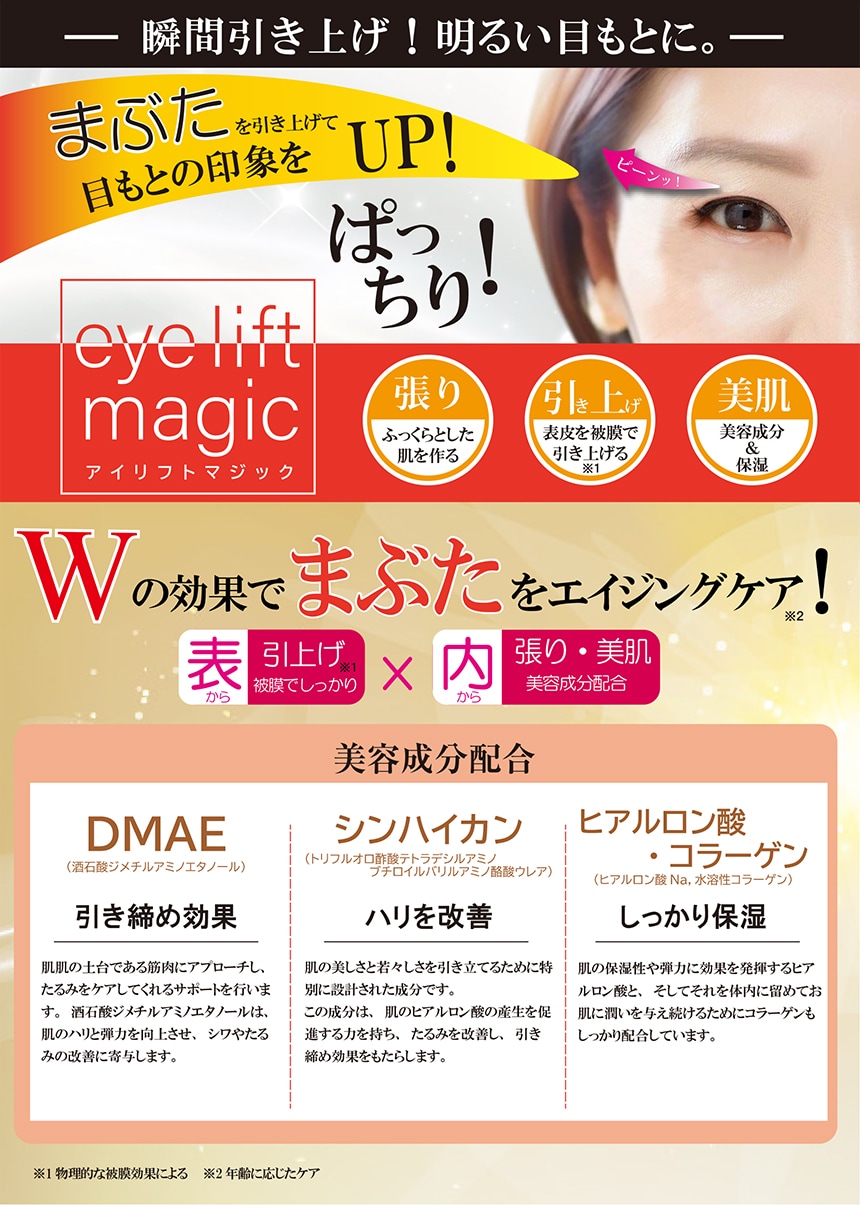 年齢とともに張りを失いがちなまぶたの皮膚に働きかけ、被膜によってリフトアップ効果を与えます。