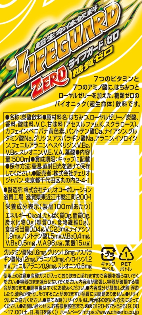 [48本]チェリオコーポレーション ライフガード ZERO 500ml | エナジー系炭酸飲料のロングセラー「ライフガード」の糖質ゼロ、カロリーゼロバージョンです。