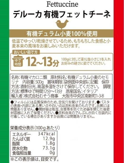 [12袋]むそう商事 JAS有機パスタフェットチーネ (De Luca) 500g | 低温でゆっくり乾燥させているため、もちもちした食感と小麦本来の風味をお楽しみいただけます。