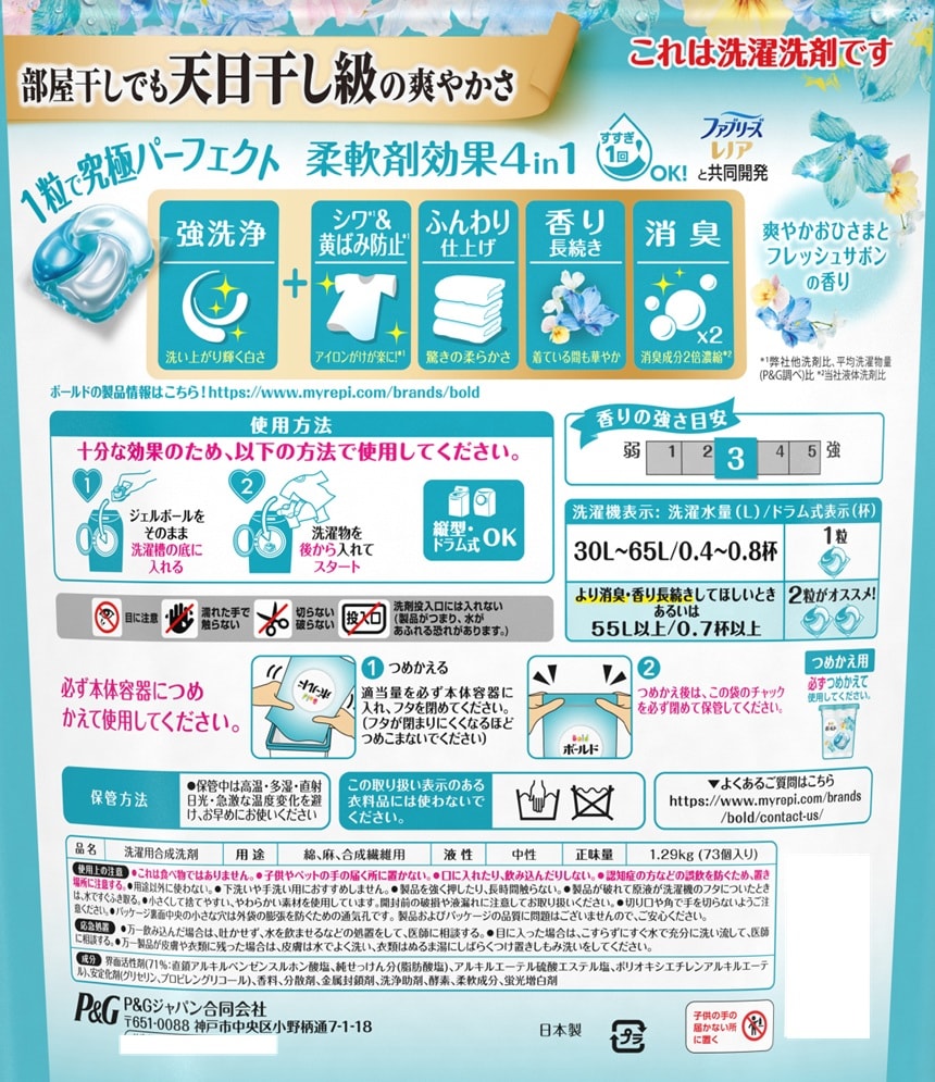 [4袋]P&Gジャパン ボールド ジェルボール4D 爽やかフレッシュフラワーサボンの香り つめかえ超メガジャンボサイズ 73個入 | 部屋干しでも天日干し級の爽やかさ!