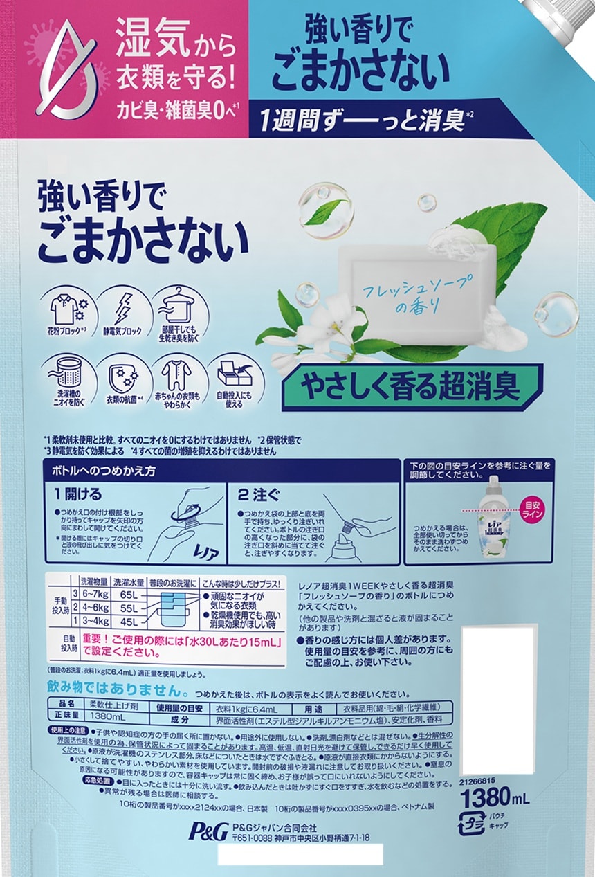 [6個]P&Gジャパン レノア 超消臭 1week やさしく香る超消臭フレッシュソープの香り つめかえ用超特大サイズ 1380ml | ニオイ悩みに対して洗濯製品初「湿気バリア成分」を配合
