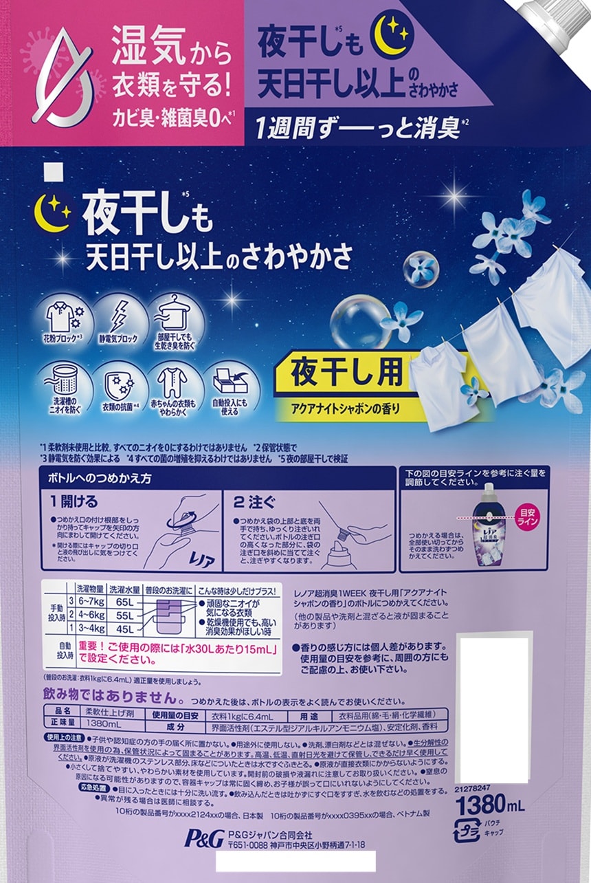 - レノア 超消臭 1week 夜干し用 アクアナイトシャボンの香り つめかえ用超特大サイズ 1380ml