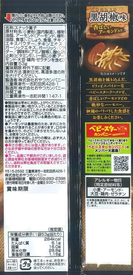 - ベビースター ラーメンおつまみ 黒胡椒味 香ばしいアーモンド入り 53g