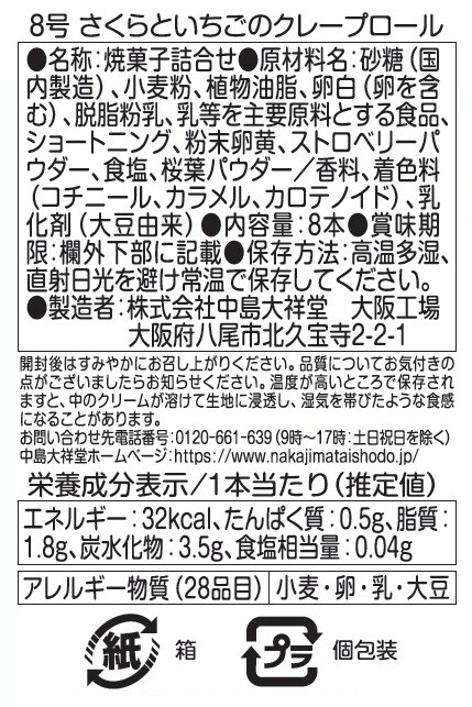 [12箱]中島大祥堂 さくらといちごのクレープロール8号 8本 | さくら香るサクサククレープに甘酸っぱいいちごクリームを合わせました。
