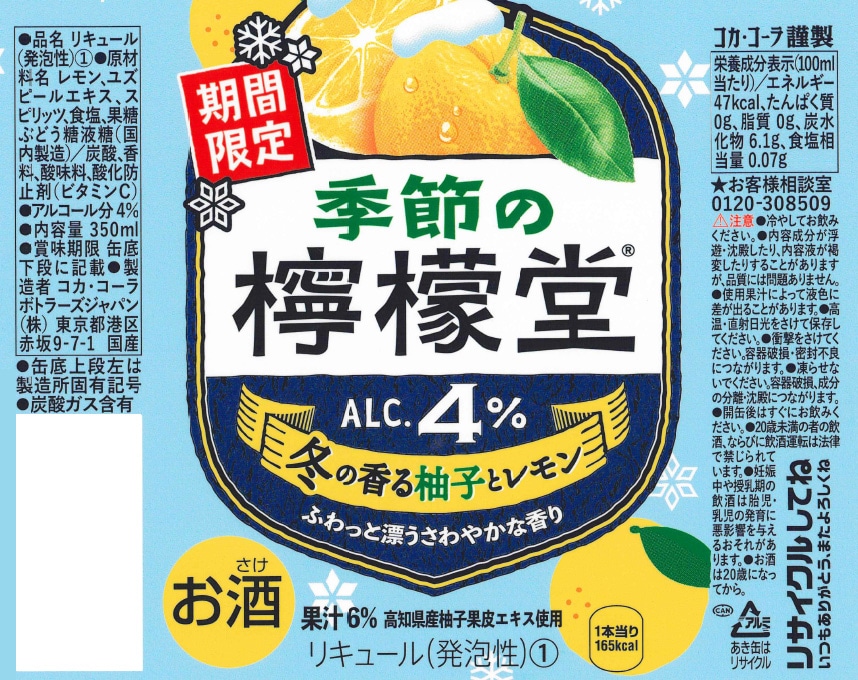 「冬の香る柚子とレモン」は、日本の四季のおいしさを楽しむ季節の檸檬堂シリーズの冬限定製品です。冬を感じる柚子の「さわやかな香り」とレモンの「すっきりした味わい」で飲み飽きしない美味しさ。あったかお鍋などとご一緒に!アルコール分4%果汁6%、高知県産柚子果皮エキス使用