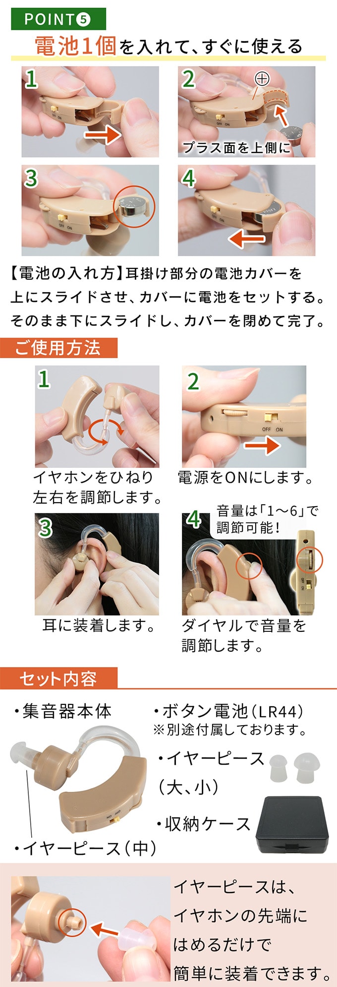 ・セット内容:集音器本体✕1個、ボタン電池LR44×2個、イヤーピース(大・中・小)、収納ケース