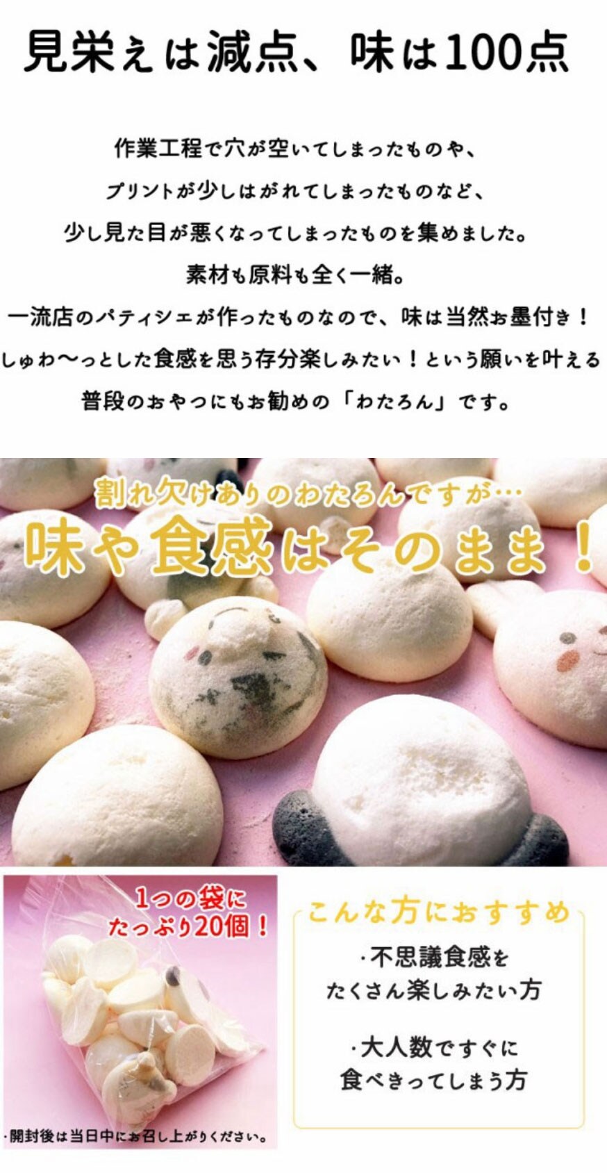 マカロン【わたろん】不ぞろい品 わたろん Bセット 20個入り | マカロンのようにコロッとまぁるい形に綿菓子のようななつかしい味