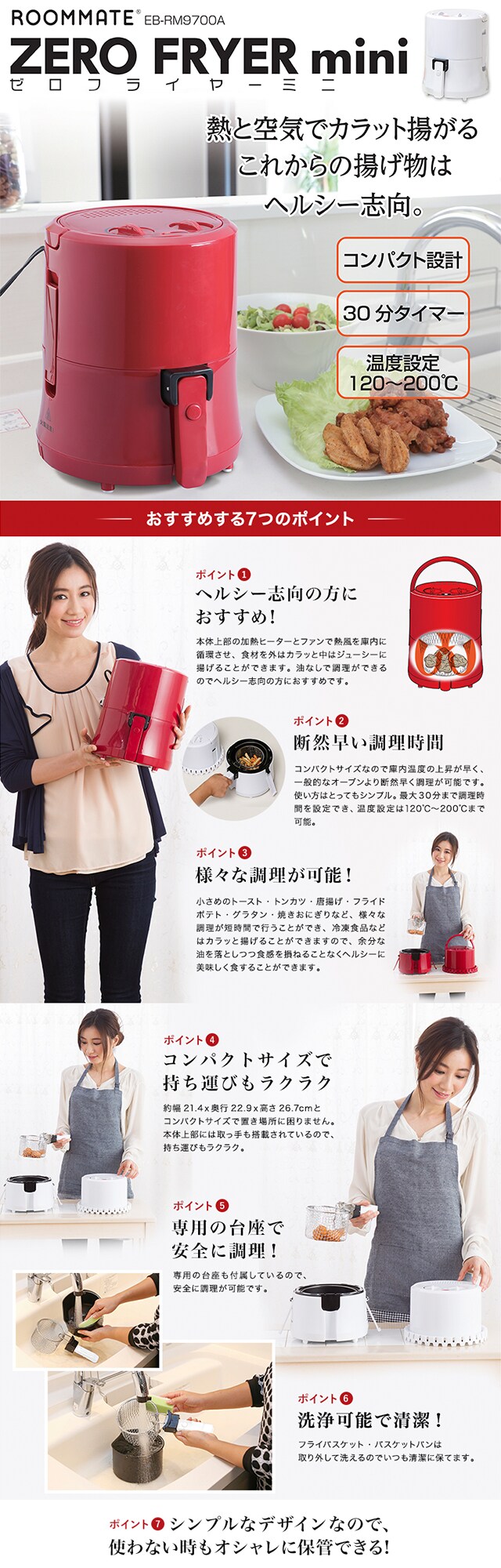 ROOMMATE ゼロフライヤーミニ レッド EB-RM9700A-RD | 熱と空気でカラッと揚がる♪夏は揚げ物とビールで乾杯!!