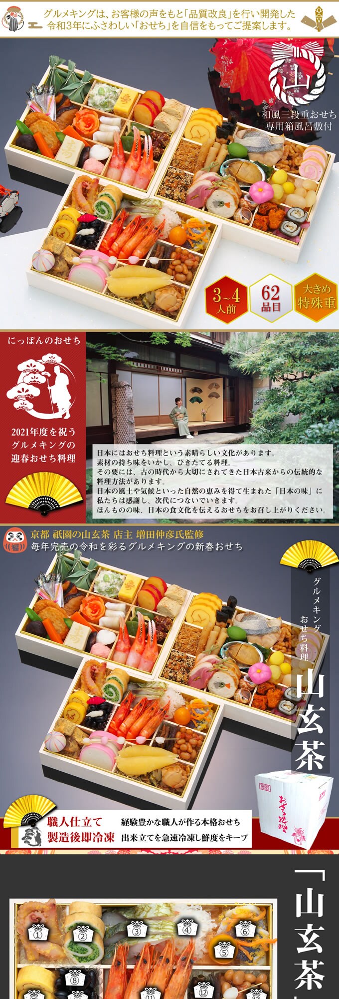 【特殊重62品目3-4人前】京都祇園 名店 山玄茶 店主 増田伸彦氏 監修おせち料理 「山玄茶」 | 本格料亭のおせち 3人、4人前 食べきりサイズの3段重