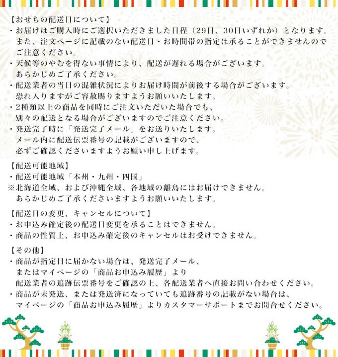 ・配送日時の指定:「発送予定日」に配送日指定の記載がある場合に、ご利用可能です。