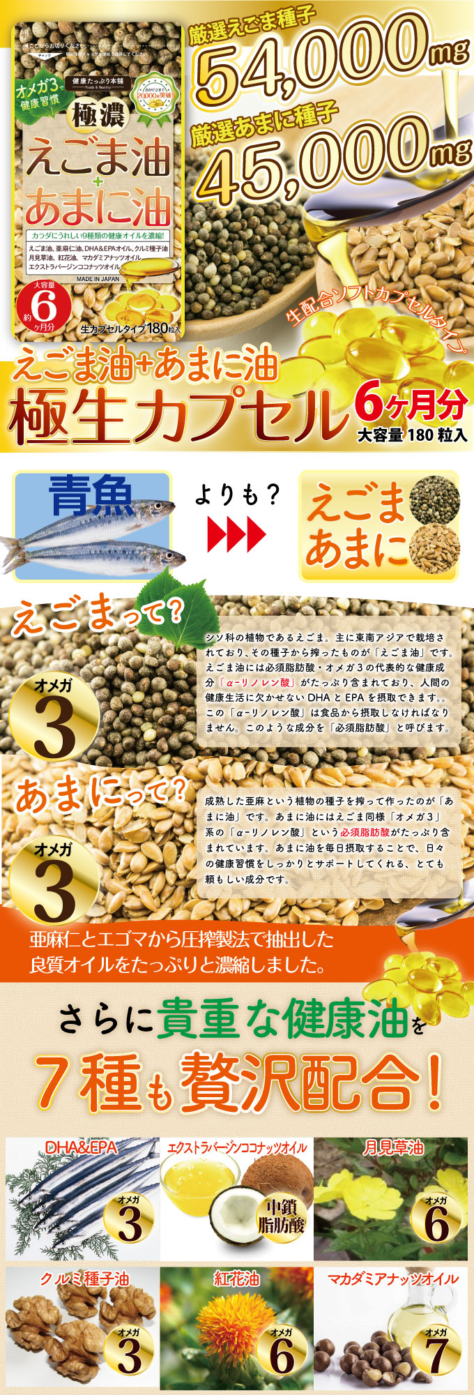 ・原材料/材質/素材:エゴマ油、亜麻仁油、DHA・EPA含有精製魚油、クルミ種子油、月見草油、マカダミアナッツオイル、サフラワー油、ココナッツオイル、ビタミンE含有精製魚油/ゼラチン、グリセリン