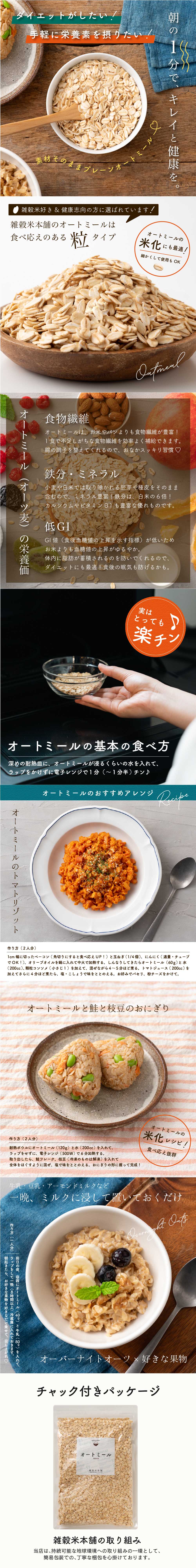・お召し上がり方:深い皿にオートミールと、オートミールが浸るくらいの水か牛乳を入れて、ラップをして電子レンジで1〜2分加熱すると、簡単に食べられます。
