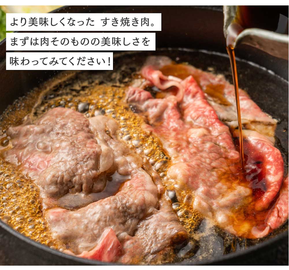 牛肉の中でも特にサーロインの脂は肉の部位の中でも一番上等とされています!口にした瞬間、上品な甘みが口いっぱいに広がりますので、すき焼きにした時には存分に旨味が感じることができます。良いお肉だからこそシンプルな味付けで味わって頂きたい!更に、とろけた脂が鍋全体に染み渡り、全ての食材を美味しく仕上げます!