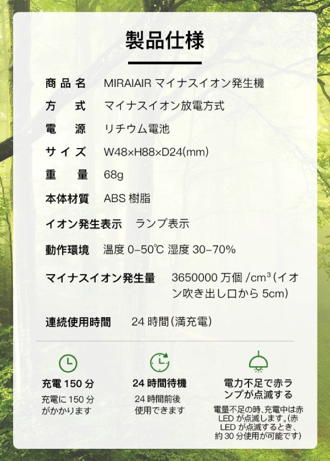 マイナスイオン発生量: 3650000個/cm3(イオン吹き出し口から5cm)