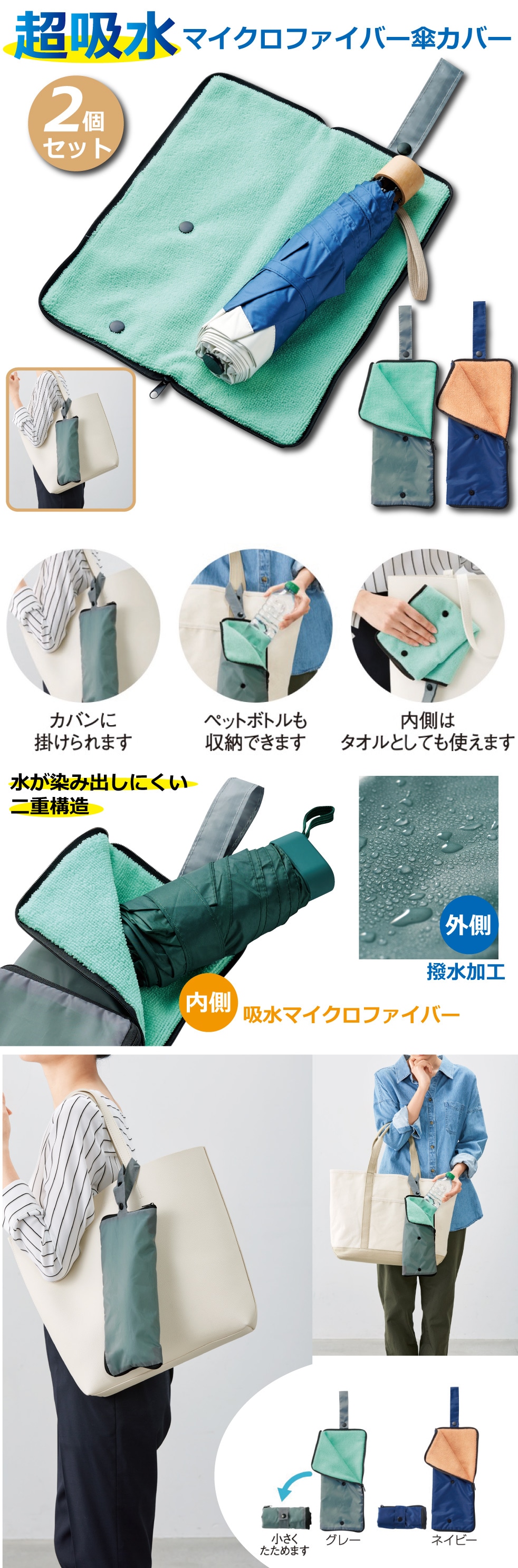 【2個セット】超吸水!マイクロファイバー傘カバー | マイクロファイバーが水滴をしっかり吸収!水が染み出しにくい二重構造が嬉しい♪