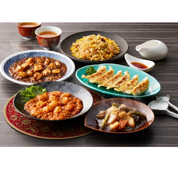 - 乾焼蝦仁(エビチリソース)150g、四川麻婆豆腐150g、餃子120g(6個入)、ふっくら五目炒飯(200g×2)、本格八宝菜150g×各1
