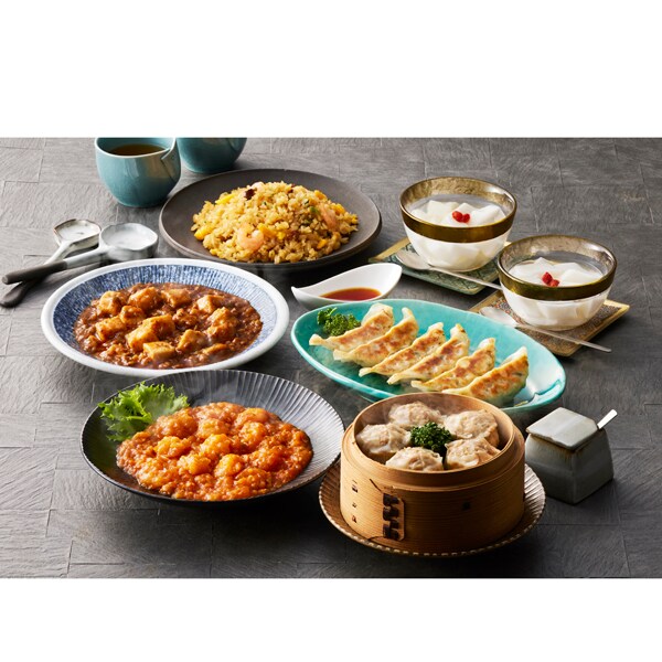 - 乾焼蝦仁(エビチリソース)150g、四川麻婆豆腐150g、餃子120g(6個入)、ふっくら五目炒飯(200g×2)、貝柱入焼売150g(5個入)、杏仁豆腐500g×各1